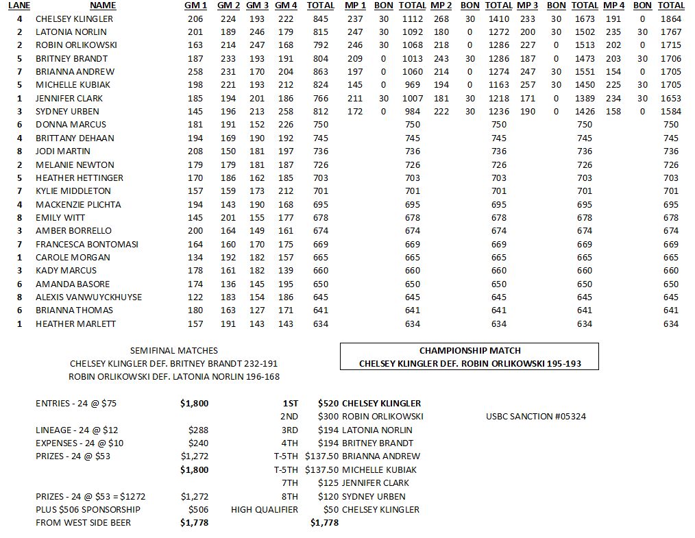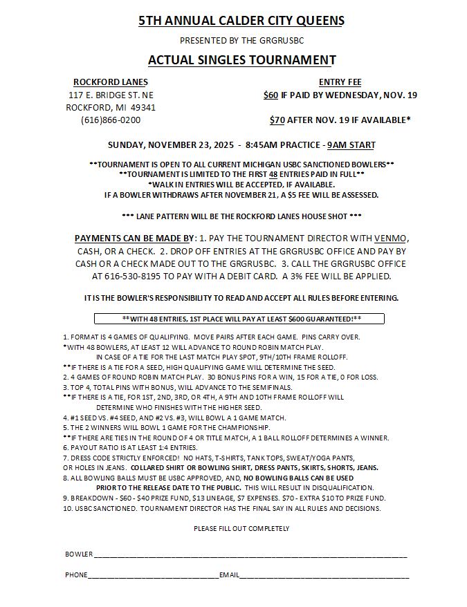 The Calder City Queens is a scratch singles event.  This tournament is open to the first 48 paid in full entries.  All entrants must be currently sanctioned in Michigan.  This tournament will be bowled on the house shot of the hosting bowling center. Greater Grand Rapids All City Points are awarded for the top 10 finishers.  Bowlers must bowl in the Greater Grand Rapids USBC to receive the points earned.
